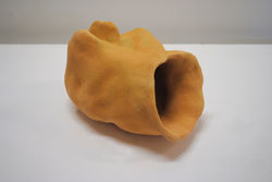 les traces de couleurs d’une fresque, est fragmentée en deux parties qui viennent rencontrer l’espace d’exposition. Les sculptures hybrides et organiques sont disposées au sol comme